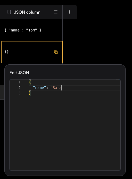 A JSON column allows you to store and edit structured JSON objects directly in the Playground. Each cell can contain a JSON value, making it easy to work with complex data structures. When editing a cell, an Edit JSON panel opens with syntax highlighting and formatting support, so you can quickly add or update fields.