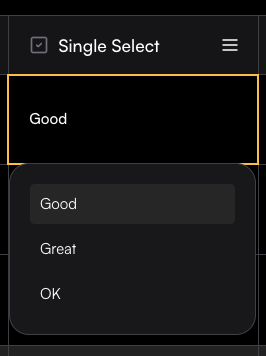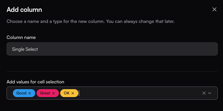 Single-choice columns let you define a set of predefined options and restrict each cell to one selection. To create one, set the column name and add options in the Create Column drawer. In the values box, type an option and press Enter to save itโonce added, it will appear as a colored label. In the table, each cell will then allow you to select only one of the defined options. This column type is especially useful for manual tagging with a single tag.