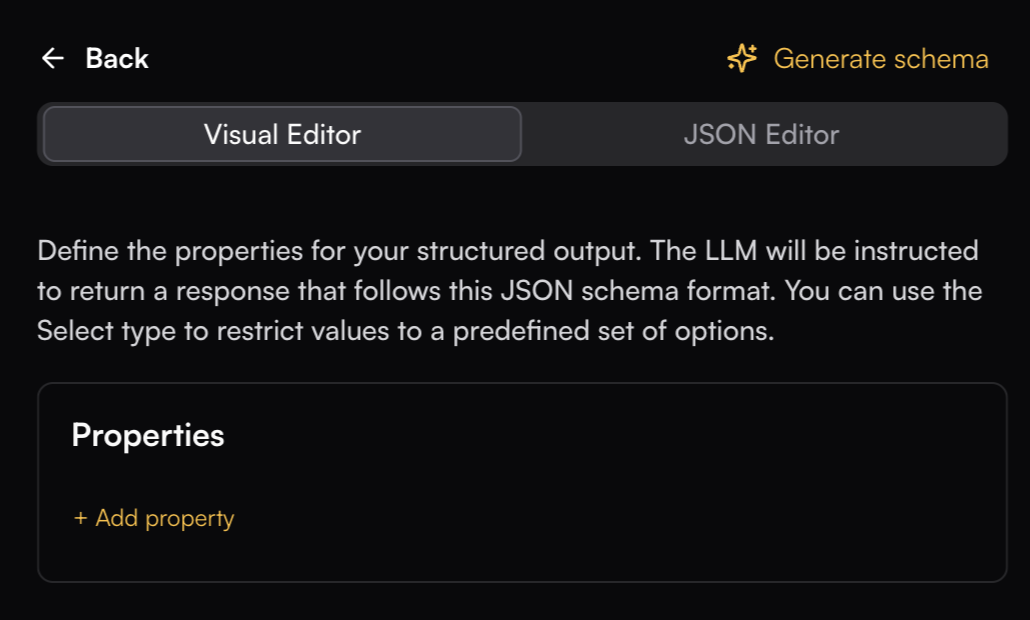 Structured output can be enabled for models that support it. You can define a schema in several ways:- JSON Editor - Write a JSON structure directly in the editor